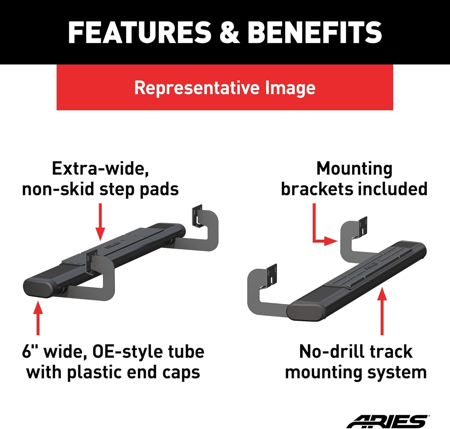 For solid footing, a comfortable step and a bold look for your truck, ARIES 6" oval side bars are a step up. They are designed to mimic the style of popular original equipment side bars and running boards, featuring two professional finish options, large non-skid step pads and tapered end caps. This particular pair of 6" ovals is made with aluminum alloy to be strong and lightweight. Aluminum construction makes them completely impervious to rust, and for an extra layer of corrosion protection, they come with a durable semi-gloss black powder coat finish. They are also available in polished 304 stainless steel. To protect the interior of the tubes, all 6" oval sides are equipped with hard ABS plastic end caps. The end caps come pre-attached to the tubes and feature a tapered design, lending to the overall OE look of the side bars and providing a professional finishing touch on your truck or SUV. For a sure step every time you climb into your vehicle, ARIES 6" ovals are equipped with extra-wide step pads. The step pads are made from tough polypropylene and provide a generous 5" width. The large, flat surface offers comfortable footing and has a textured surface to prevent slipping, even when wet. The polypropylene construction makes the step pads durable and crack-resistant for long-lasting use. ARIES 6" oval side bars are also made for easy, no-drill installation. The boards themselves feature a track system for versatile application, and they mount using vehicle-specific brackets for a custom fit on certain years of the Ram 1500, 1500 Classic, 2500 and 3500 (see application info to verify fitment). The mounting brackets are made from high-strength carbon steel and use pre-existing holes to eliminate drilling during the installation process.