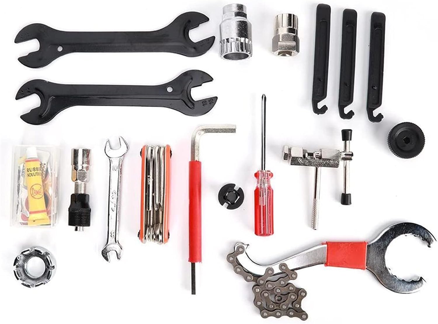 Specification:Item Type: Bicycle Repair ToolMaterial: Stainless SteelWeight: Approx. 1758gPackage List:2 X Black Wrench1 X Small Wrench(Silver)3 X Tire Patch1 X Glue1 X Cymbal2 X Rubber Tube1 X Crankset1 X Red Chain Stopper1 X Combination Repairer1 X Gear1 X Repairer With Chain 1 X Chain Cutter2 X Bottom Bracket(One Large One Small)3 X Pry Tire1 X Screw Pen1 X Plastic Gear
