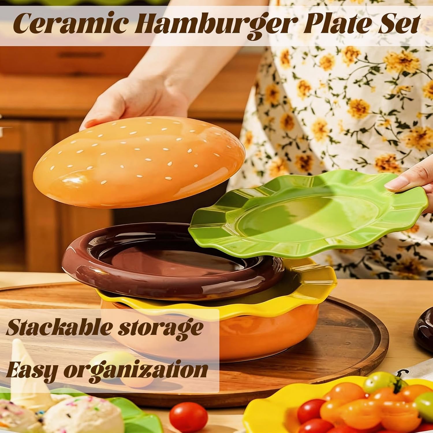 Q1: Is this burger plates set made of plastic or ceramic? A: This set is made from high-fired ceramic, not plastic. Each piece has a solid weight and a smooth glazed finish, designed for real dining use rather than disposable party plates Q2: Are these plates full size or mini? A: These are full size hamburger shaped plates and bowls, suitable for serving actual portions such as burgers, salads, desserts, snacks, and dips Q3: Is the set dishwasher safe? A: Yes, the entire ceramic hamburger plate set is dishwasher safe. The durable glaze resists stains and fading for easy maintenance Q4: Can each layer be used separately? A: Yes, each layer functions independently as a plate or bowl, allowing flexible serving for different dishes and occasions Q5: Is this suitable as a gift? A: Absolutely. The realistic burger design and novelty tableware concept make it a unique and fun gift for housewarmings, birthdays, BBQ lovers, and party hosts Product Specifications Product Name: Burger Plates Set Material: High-Fired Ceramic Overall Dimensions: Approx. 6.5 x 6.5 x 5.31 inches (16.5 x 16.5 x 13.5 cm) Total Weight: Approx. 3.14 lbs (1424 g) Set Includes: 1 × 5-Piece Ceramic Hamburger Plate Set