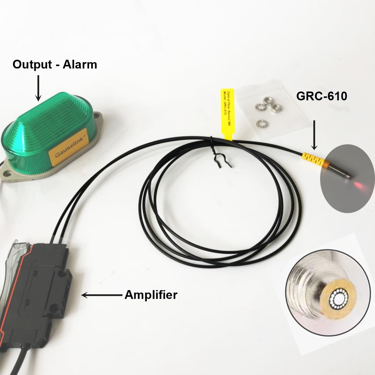 Sensors1. Product Parameters- Product Name: Optical Fiber Sensor with Coaxial Multiple Cores- Type: Diffuse Reflective- Material of optical fiber: Plastic- Material of optical fiber probe: Stainless Steel- Ambient Temperature: -35 - 50Note: Color and Decoration may vary from those shown.2. Attractive Features2.1 Coaxial multiple cores which highly increase the precision and swiftness of detection on approaching objects from different direction (left right up down).GRC-310 (M3) and GRC-410 (M4) have 9 cores separately and GRC-610 (M6) has 16 cores which receive the reflective light from different directions, compared with single core receiver.2.2 Strong anti-interference ability2.3 High transmittance inner core contributes to low transmission loss.2.4 Easy installation. Tiny size. It can go through very narrow space and small tube to detect small object.3. Drawings and dimensionsNote: As measured by hand, dimensions have small deviation.4. Compatibility with AmplifiersThe optical fiber sensors are also compatible with various amplifiers in the market. Amplifier not included and sold separately.5. Installation Instructions5.1 Connection to AmplifierThe optical fiber cable with single core is inserted into the hole of amplifier that is emitting light.The cable with multiple cores is inserted into the hole that is receiving light.Refer to diagram below. Amplifier sold separately at this store.6. Applicable FieldsThe optical fiber sensors are widely used in various fields including but not limited to:(1) Security Equipment (Attention: Don't use it for human body protection).(2) Machinery (3) CNC machining equipment(4) Goods Security Inspection(5) Automation(6) Electro-Mechanical MachineryThe outstanding feature is that working with amplifier (sold separately) it can detect transparent objects (e.g. glass cup, glass bottle, transparent plastic box) which traditional switches cannot.Customers' Application Cases:See the picture below.The optical fiber sensor (circled in yellow) is detecting transparent bottles of liquid on running production line.The optical fiber sensor is monitoring the circular movement of object at laboratory.The sensor is detecting the edge of white paper sheet on box-making machine.The sensor is detecing work piece on punching machine.Demonstrated Model in Video of this link:GRC-610, working with amplifier (E3X-SV11) with output to alarm.7. Other Items that you may be interested on7.1 Amplifier7.2 Color Identification Amplifier7.3 Focus LensIf object is very small and detection distance is very short, focus lens are available and sold separately.Click the picture below to choose.==========Hign-concerned Chemical : NoneMaterial : PlasticCertification : NoneSwitch Type : SwitchModel Number : GRC-310/410/610Item Type : SWITCHESIs Smart Device : NoOrigin : Mainland
