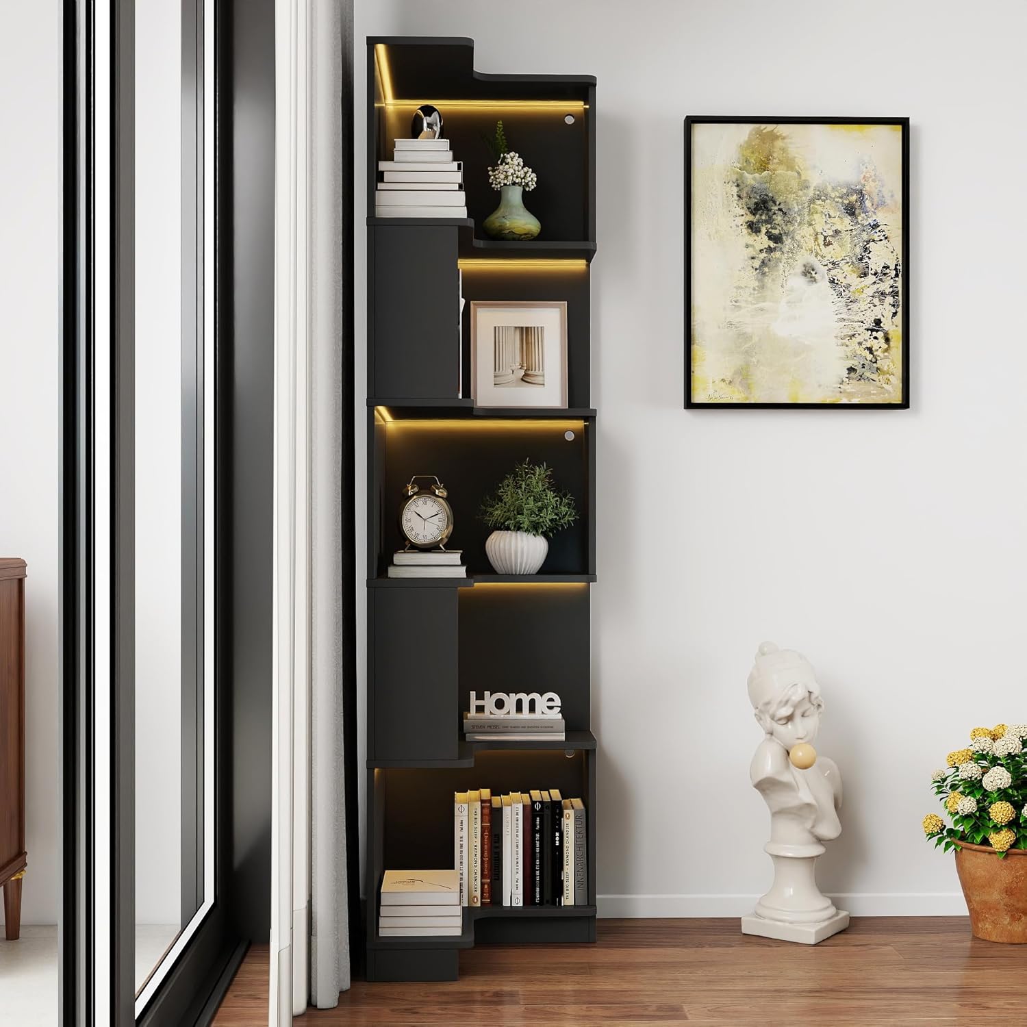 | Additional Features | Corner Book Shelf - 5 Tier Corner Bookshelf Bookcase with Baffle, Freestanding L Shaped Display Shelf Stand with LED Lights |