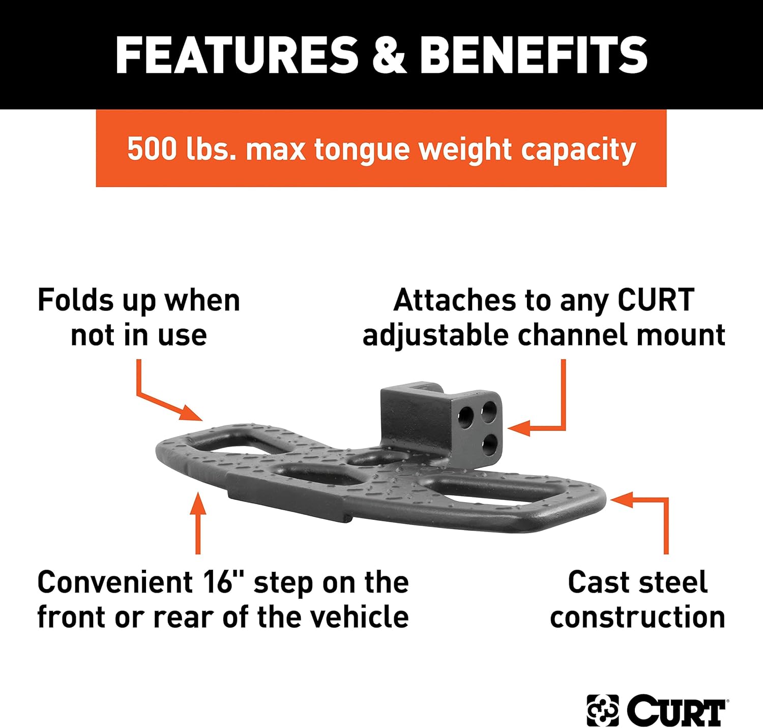 The CURT adjustable channel mount hitch step adds functionality and convenience to any truck, van or SUV. It features a highly versatile design, a heavy-duty steel construction and a safe, dependable step up into your vehicle. The CURT folding hitch step is engineered to attach to any CURT adjustable channel mount. The channel system allows for easy height adjustment to accommodate virtually any size vehicle. With the hitch step attached to the channel mount, it can be inserted into any 2" or 2-1/2" receiver hitch opening on the front of rear of the vehicle (channel mount sold separately). Having the adjustable hitch step on the rear provides a safe, convenient stepping surface for accessing the truck bed or trunk / cargo area. Having the hitch step on the front of the vehicle allows for easier access when working under the hood. When the hitch step is not in use, it can easily be folded up and out of the way to avoid unnecessary obstructions. The CURT folding hitch step is perfect for work trucks, delivery vehicles, commercials vans and much more. It features a textured surface with raised metal treads for a non-skid step, and it is constructed from cast steel for reliable strength. To face any job in any season, it comes with a durable carbide black powder coat finish for long-lasting rust, chip and UV protection.