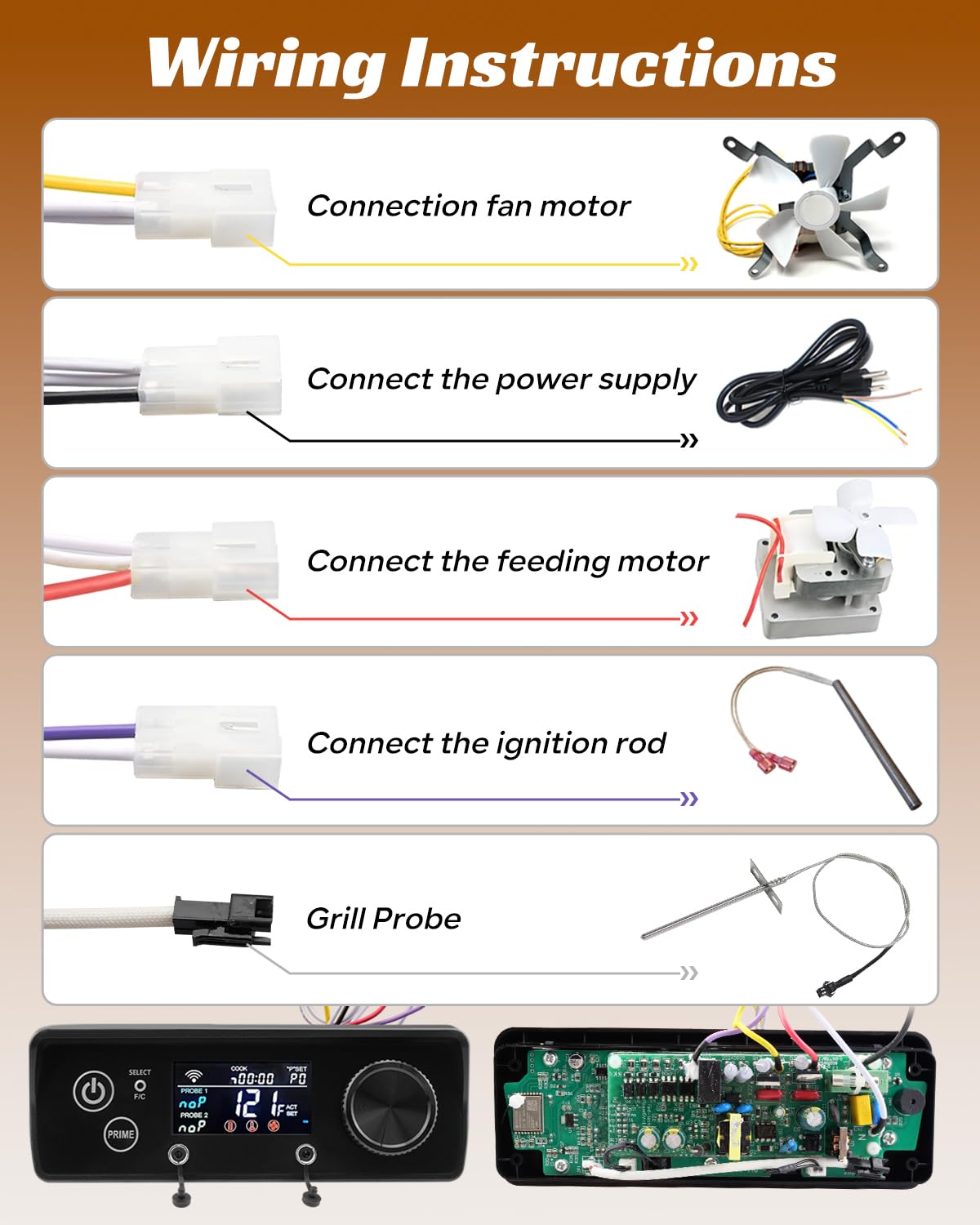 Real-Time Status Monitoring: The APP displays key data like grill temperature, pellet remaining, and meat temperature in real-time, allowing you to track cooking progress without frequent grill checks. Multiple Cooking Modes Support: Precise temperature control caters to low-temperature smoking, high-temperature grilling, baking, etc., making it easy to prepare various dishes. Meat Probe Alarm Function: Set the target temperature for the meat probe, and the controller will alarm immediately when the meat reaches that temperature, preventing overcooking or undercooking for perfect taste. Extends Equipment Life: The fault detection system timely identifies problems and protects the device, reducing chain failures caused by component damage and extending the overall service life of the grill. Quiet Operation Design: The "puff" sound during operation is from normal PID system adjustment, with low volume, not disturbing home or outdoor gatherings. Adapts to Complex Environments: The controller's material is resistant to high and low temperatures and corrosion, working steadily in complex outdoor environments like sun and rain, ensuring cooking is not affected. Firmware Online Upgrade: Supports online firmware upgrade via APP, continuously optimizing functions for more new features and performance improvements. Detailed Installation Guide: Comes with a clear installation manual, combining pictures and text to guide steps, allowing even beginners to quickly complete replacement and installation.