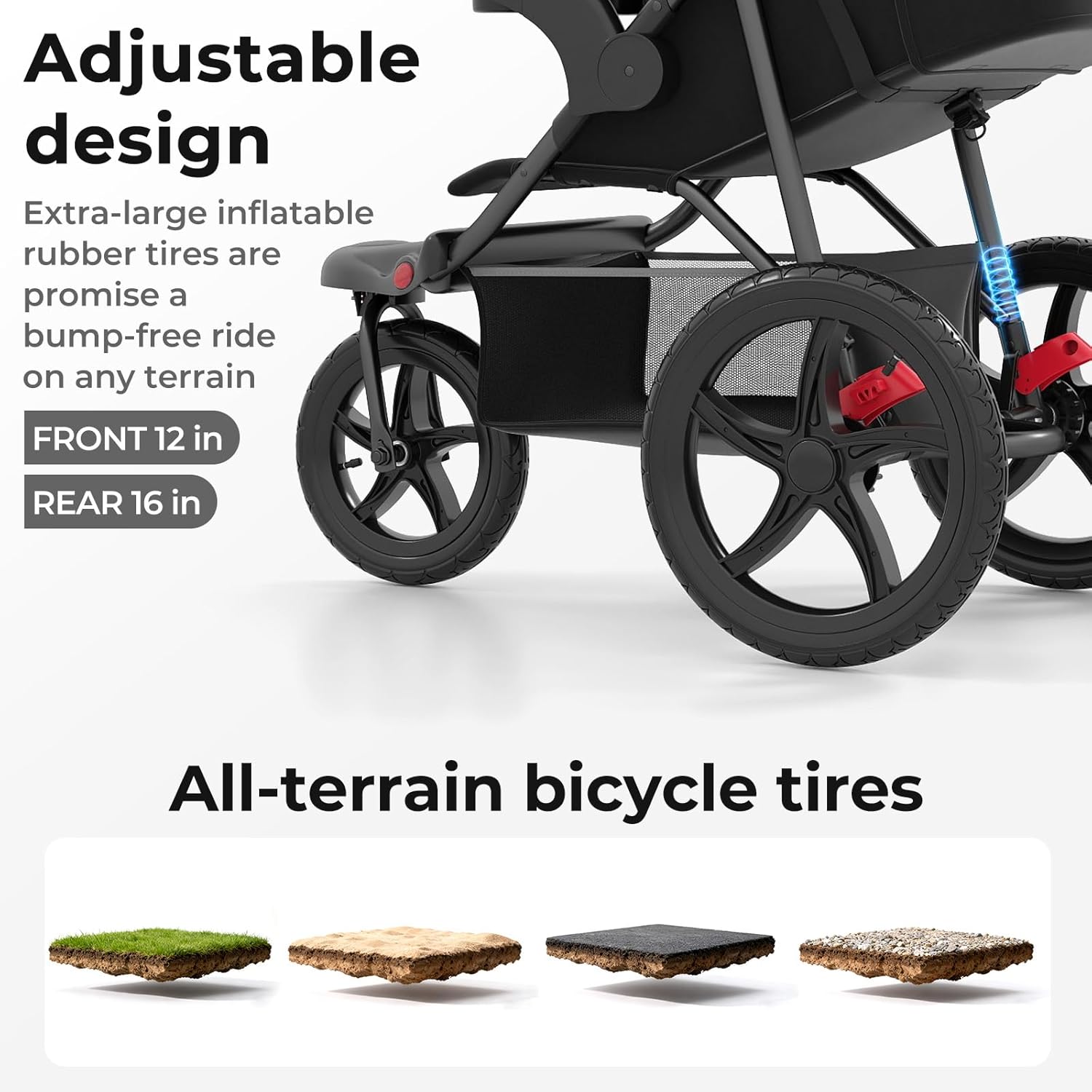 INFANS running stroller for babies is simply a thoughtful helper for parents taking their kids out, covering every detail from safety and comfort to practicality! It comes with a brake system on the rear wheels—just a light press locks both wheels at the same time. The front wheels are both flexibly swiveling and direction locking. Paired with a 5-point safety harness, it fully safeguards baby’s safety at all angles. The zip-extend canopy is equipped with a thoughtful peek-a-boo window on top. The backrest angle offers 100°-166° adjustment to match baby’s posture, whether they’re sitting up or lying down. The front tray supports one-sided removal for easy access when lifting baby in or out, and there’s a dedicated footrest area to rest comfortably. The rubber tires of this folding baby pushchair work well on concrete sidewalks for daily commutes, as well as lawns, gravel paths and soils for outdoor. Cup holders are installed on both the front and rear of the stroller, keeping parents’ coffee or the baby’s water bottle within easy reach at all times. The rear cup holders even have a hidden compartment for small items like keys. Under the jogger stroller, a storage basket can hold diapers, small snacks, and more. Made of sturdy iron frame, it provides stable support and can safely carry babies aged 6–36 months who weigh no more than 33 lbs. Better still, it’s foldable—once folded, it fits easily into the trunk of your car.