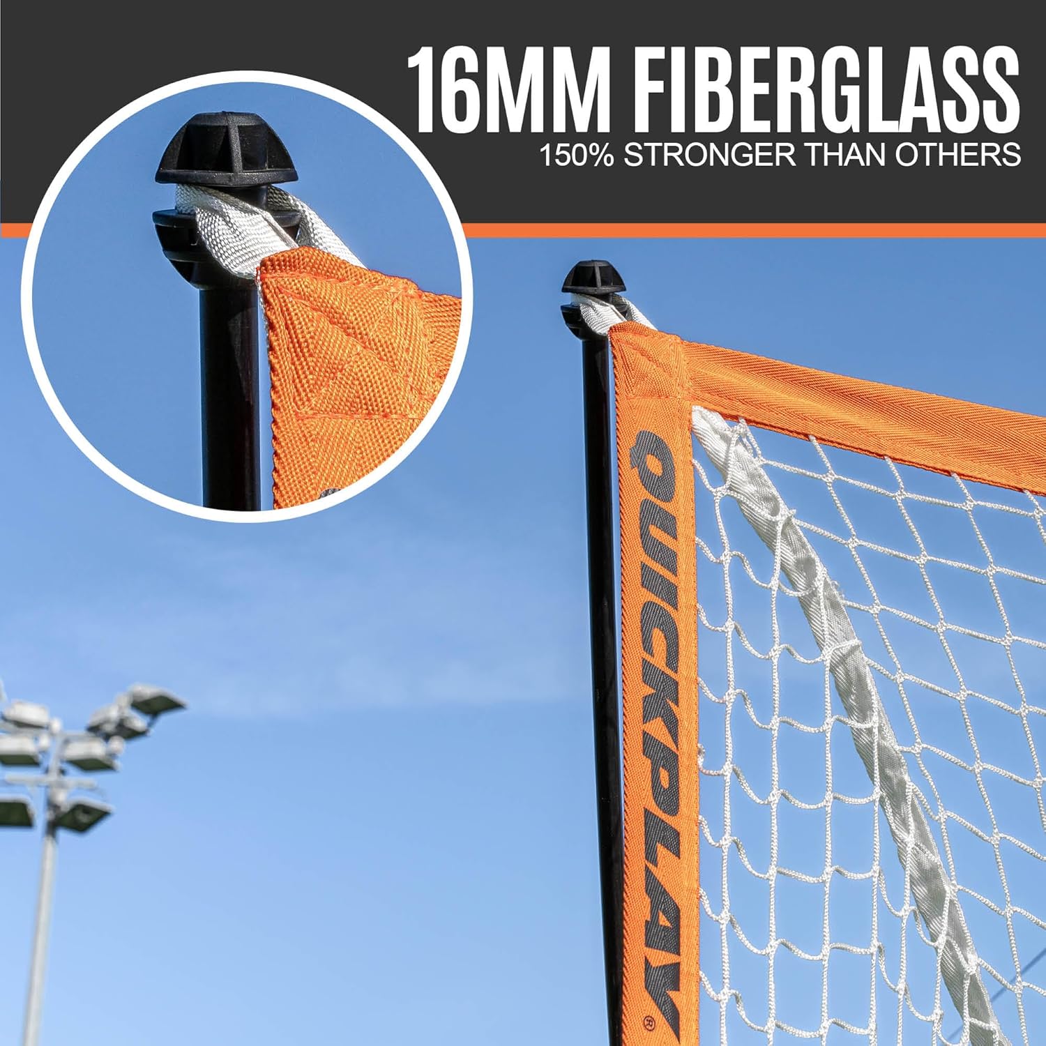 | Material Type | 1” x 1” Steel box section orange base frame, Black rubber feet, Reinforced fibreglass uprights, White Teflon mesh net with a polyester orange webbing frame |