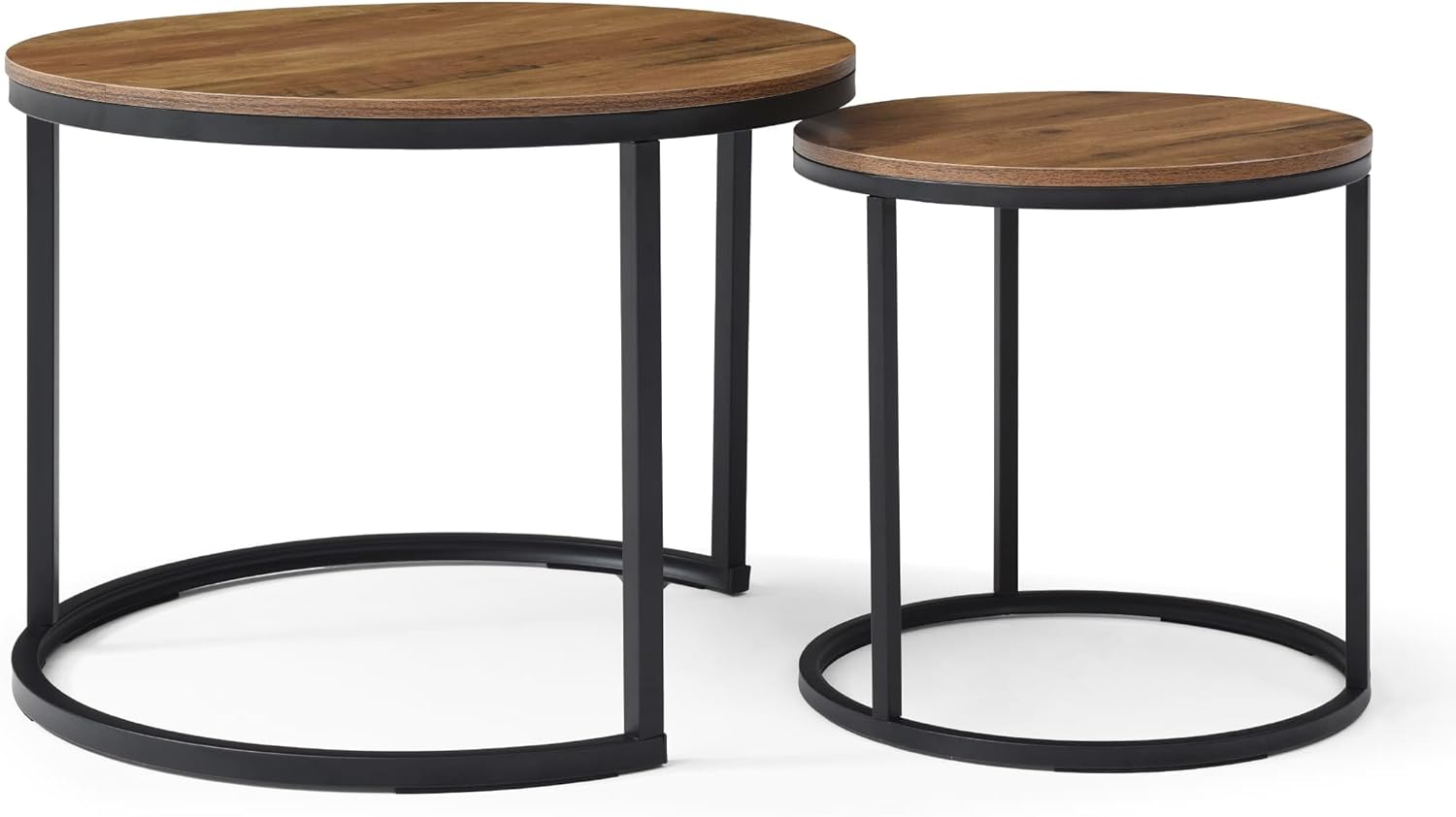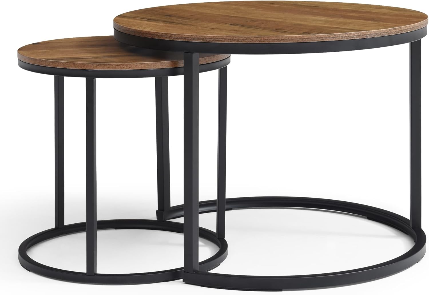 Round Nesting Tables, Sofa Side Table Set of 2, Coffee Table | End Tables for Living Room Bedroom Balcony, Walnut Top Stacking Coffee Table with Black Steel Frame Black | Brown