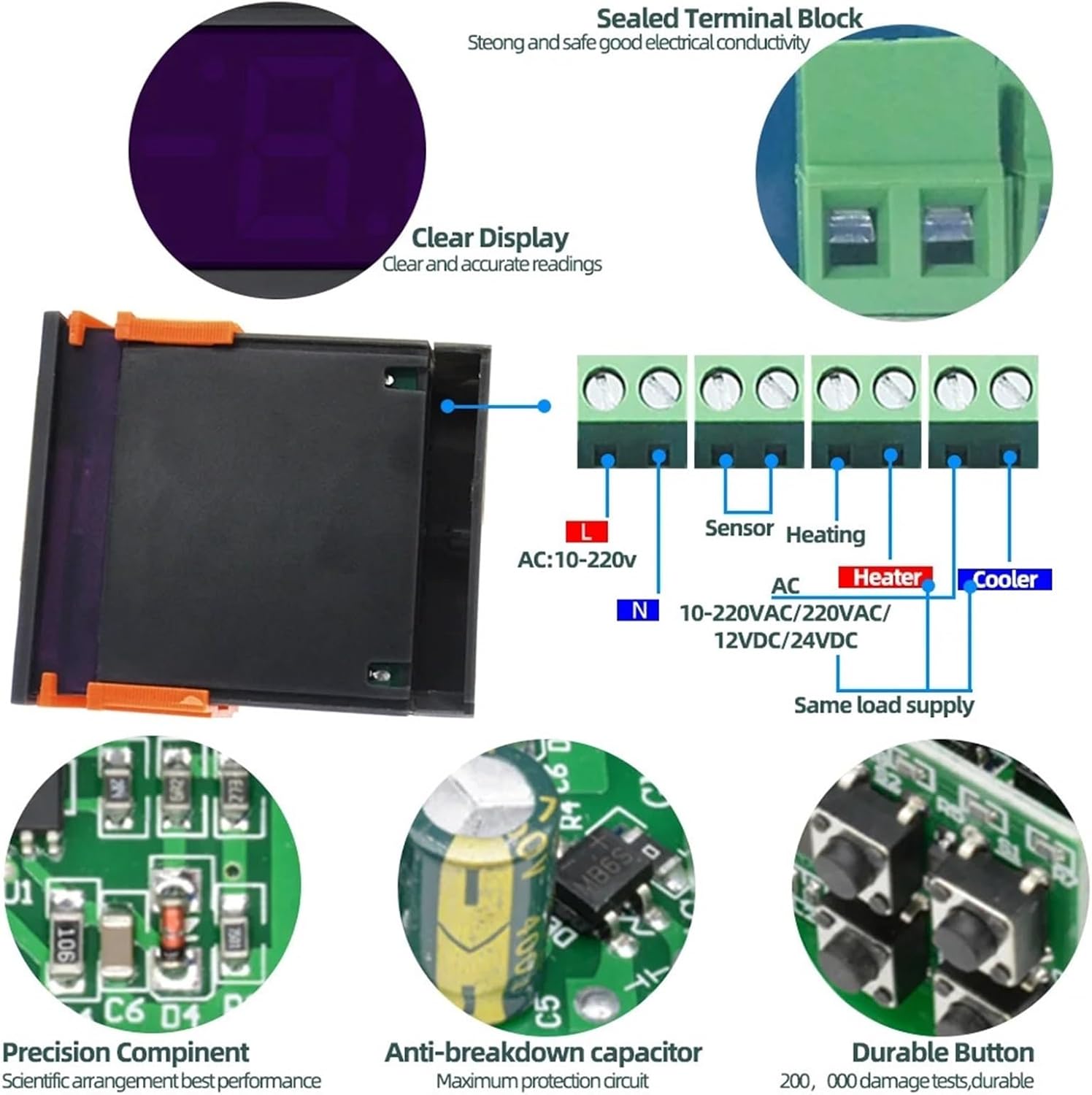 AmmetersSTC-1000 Thermostat Temperature Controller Thermoregulator Incubator Relay Brewing Incubator Heater Cooler 12V 24V 220V Product Description:Switch the modes between cool and heat;Control temperature bysetting the temperature setting value and the difference value;Temperature calibration; Refrigerating control output delay protection; Alarm when temperature exceeds, temperature limit or when sensor error.Specification:Front panel size:75(L)×34.5(W)(mm)Mounting size:71(L)×29(W)(mm)Product size:75(L)×34.5(W)×85(D)(mm)Sensor length:1m(include the probe)Feature:Temperature measuring range:-50~99Resolution:0.1Accuracy:± 0.1(-50~70)sensor error delay:1 minutePower supply:220VAC±10%,50/60Hz<;3WSensor:NTC sensor(1PC)Relay contact capacity:Cool(10A/250VAC);Heat(10A/250VAC)Ambient temperature:O~60Storage temperature:-30-75Relative humidity:20~85%(No condensate)